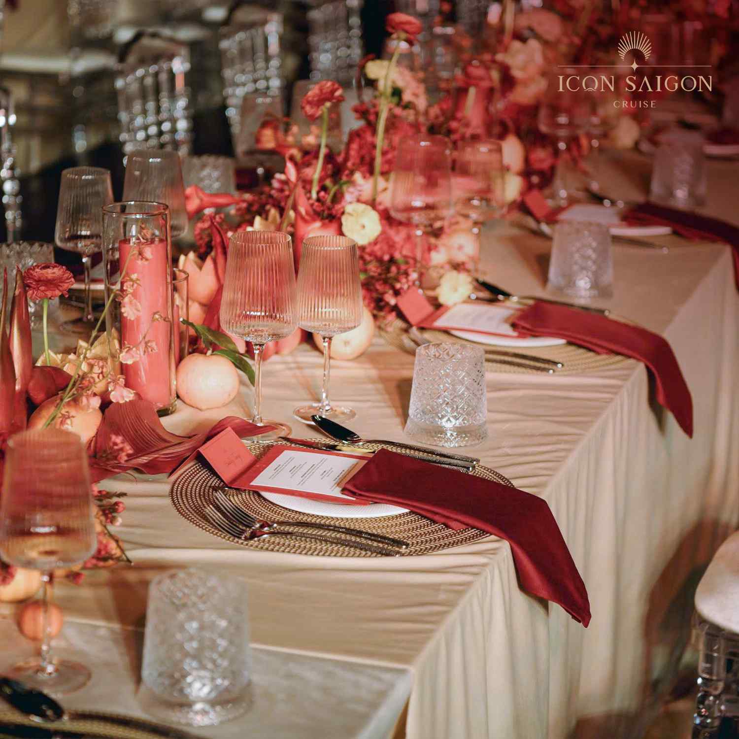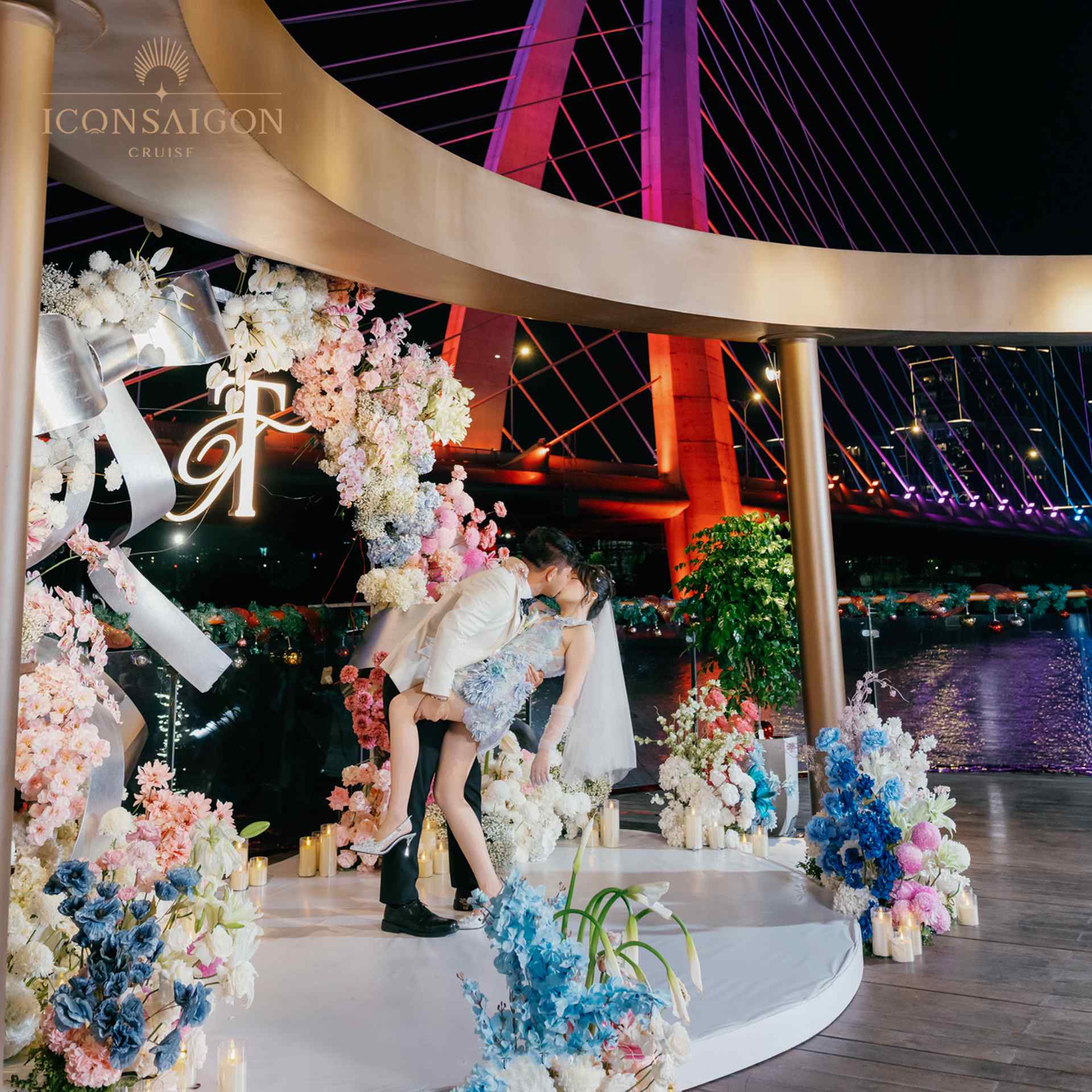 Savor sacred moments in a romantic wedding on a cruise, where shimmering lights reflect on the river and blend with elegant, sophisticated decor. Boasting a prime location in the heart of District 1, ICON Saigon offers a distinctive ceremony venue, allowing couples and guests to fully admire the city's graceful beauty and the breathtaking sunset on the river.